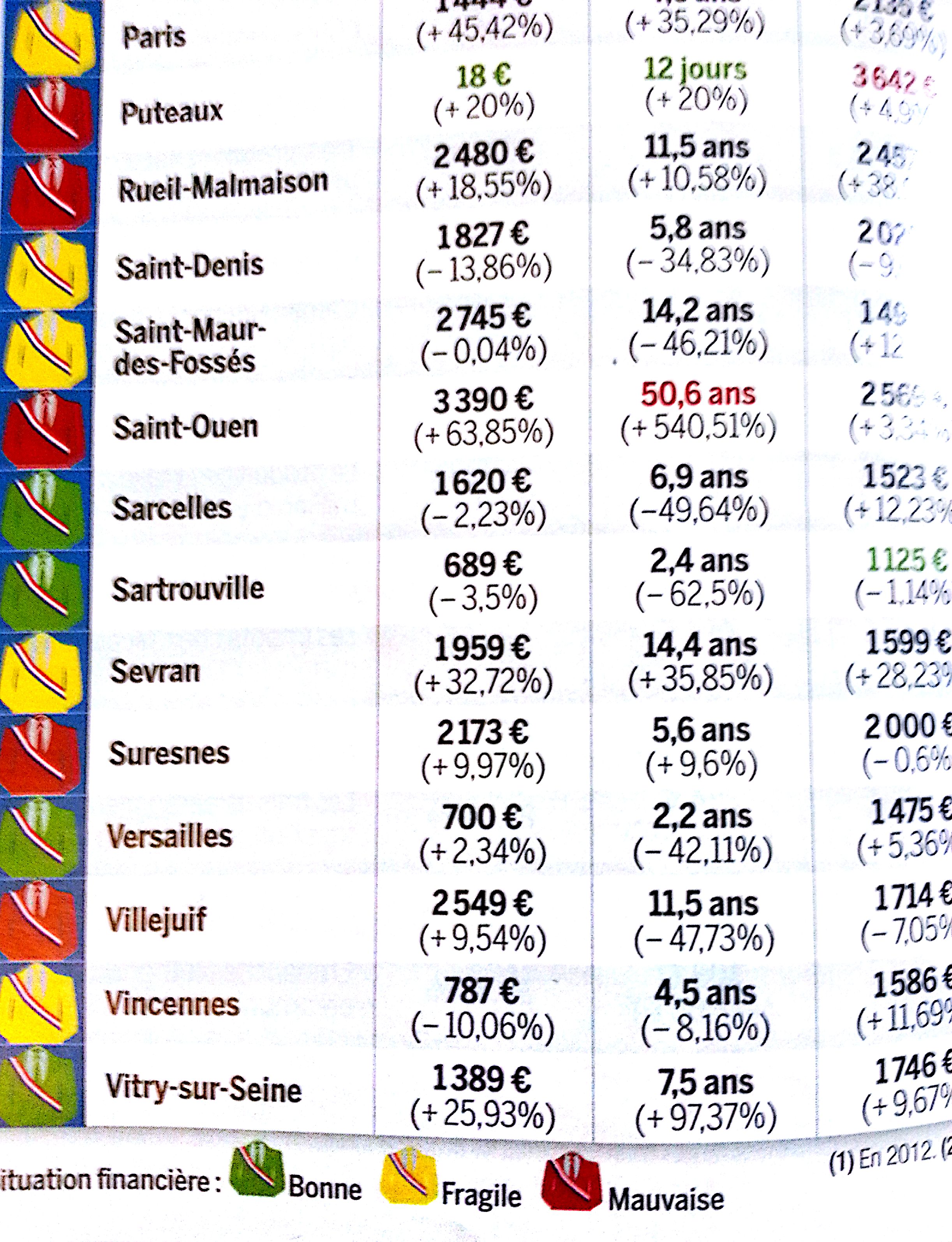 Le journal Capital de mars 2014 accorde un carton rouge à la gestion financière du maire de Rueil. Le montant total d’endettement de la ville atteint de 2480 euros/habitant et il représente un effort théorique de remboursement de 11,5 ans. On voit également sur cet autre tableau que le niveau de la dette par habitant est resté à un niveau élevé sous toute la mandature du maire actuel.