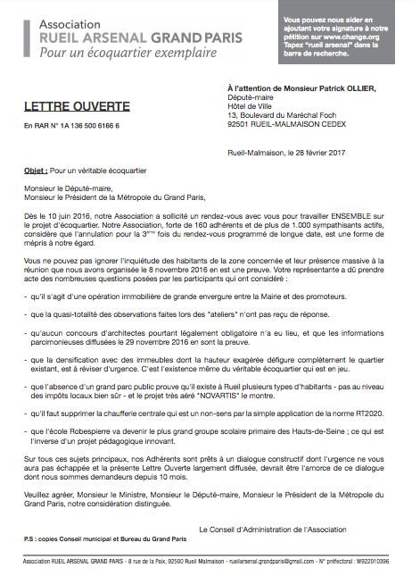 J’ai reçu récemment la lettre ouverte de l’Association Rueil Arsenal Grand Paris en faveur d’un véritable écoquartier. Nous la publions in extenso.